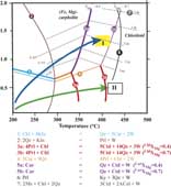 Mineral assemblage containing ferro-magnesio-carpholite with phengite, chlorite and quartz is one of the most emblematic mineral assemblage of metasediments in the KFMASH system (De Roever 1951, Goffé et al. 1973; Chopin and Schreyer 1983; Goffé and Chopin 1986, Rimmelé et al. 2003). It is encountered in various rock types, such as aluminium-rich metapelites, quartzites, marbles and albite-free pelitic schists in which it is abundant, often in veins. Textural and mineralogical observations in these rocks reveal that at low temperatures the main equilibrium reactions of ferro- and magnesio-carpholite involve quartz, kaolinite, pyrophyllite, kyanite, chlorite, chloritoid and phengite (Fig. 2a). At high temperatures large PT-fields are dominated by assemblage containing staurolite, biotite and garnet (Spear and Cheney 1989). Fe-Mg variations in mineral composition, as a function of P and T (Goffé 1982; Spear and Selverstone 1983; Vidal et al. 1992; Theye et al. l992), as well as Si isopleths in phengite (Massone and Schreyer 1987; Oberhänsli et al. 1995; Massone and Szpurka 1997; Bousquet et al. 2002) allow for relatively precise P-T estimates (Vidal et al. 2001; Parra et al. 2002a, b; Rimmelé et al. 2005) for some metapelitic compositionsIn the CFMASH system, for comparison, there is less resolution at low temperature conditions. In carbonaceous systems the stability field of the index mineral lawsonite covers the whole low-grade space, including the stability field of carpholite and the aragonite-calcite transition. While the staurolite field is substantially smaller in the CFMASH system, as compared to the KFMASH system, margarite and zoisite are characteristic of medium P and T conditions.