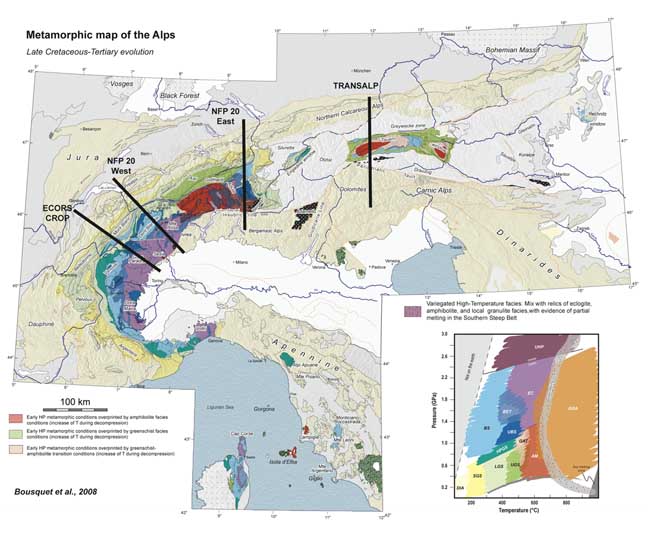 We recognize the HP-LT imprint on the European continental margin (Tauern window, Adula nappe and surrounding covers), on all the metasediments derived from the partly oceanic Valaisan domain, as well as on the Piemont-Ligurian realm (Rechnitz window, Matrei zone, Avers, Zermatt-Saas zone, Entrelor, Cottian Alps, Voltri group, Tuscany and Corsica). The situation is more complex for the units derived from the Briançonnais terrane. They indicate, going from internal to external, eclogite and UHP conditions in the “internal massifs” (Monte Rosa, Gran Paradiso, Dora Maira), blueschist conditions (Suretta cover, Mont Fort, Ruitor, Vanoise, Acceglio, Ligurian Alps, Tenda), and subduction-related greenschist and low-grade conditions (Tasna, Schams, Zone Houillère). Based on structural arguments, some authors dispose of this complexity by changing the paleogeographic attribution of the “internal massifs” (Froitzheim 2001; Pleuger et al 2005). We are agreeing with the fact that the geodynamic evolution is complex and that the “internal massifs” are part of the Briançonnais (see for example Polino et al. 1990; Borghi et al. 1996; Froitzheim et al. 1996, Dal Piaz 1999).