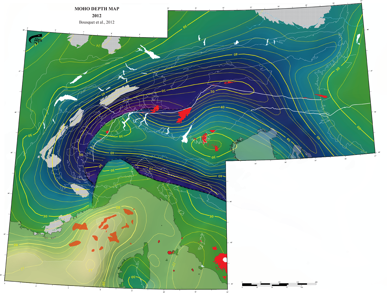 La carte de profondeur du Moho donnent une bonne indication des directions de subductions. La carte des Alpes montrent qu'actuellement la chaîne alpine est à la rencontre entre plusieurs subductions (Alpes, Apennins, Dinarides).